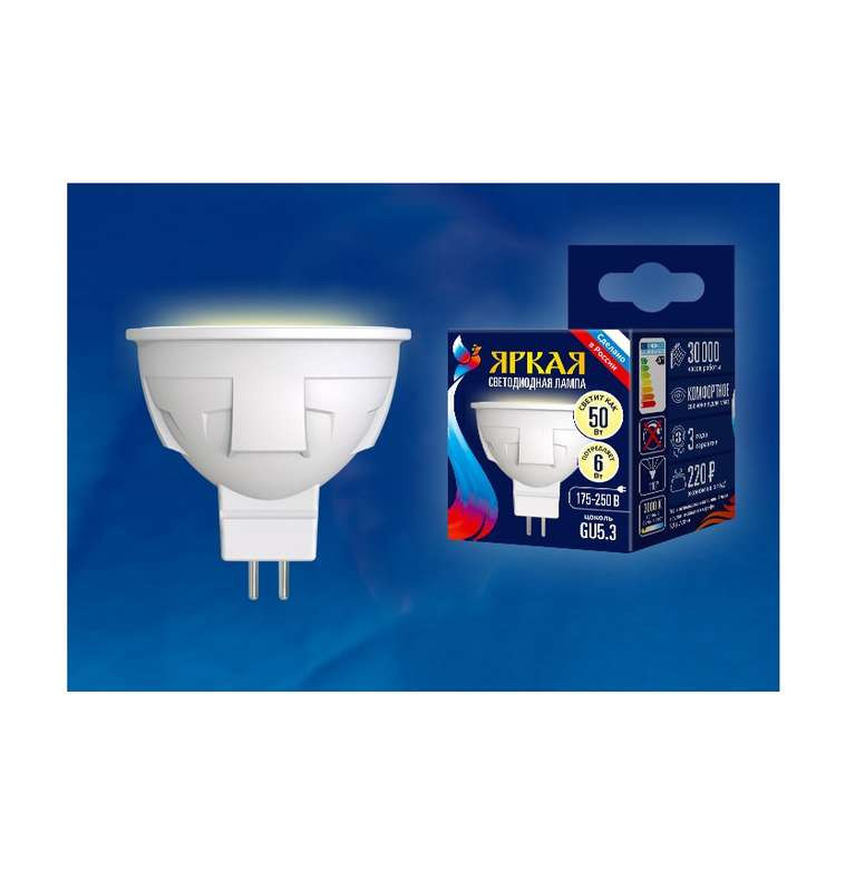 Лампа светодиодная LED-JCDR 6W/WW/GU5.3/FR PLP01WH JCDR ЯРКАЯ матовая 3000К тепл. бел. (упак. картон) Uniel UL-00002424 Uniel