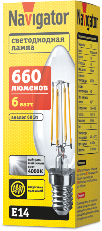 Лампа светодиодная 61 356 NLL-F-C35-6-230-4K-E14 6Вт свеча прозрачная 4000К нейтр. бел. E14 660лм 220-240В Navigator 61356 NAVIGATOR