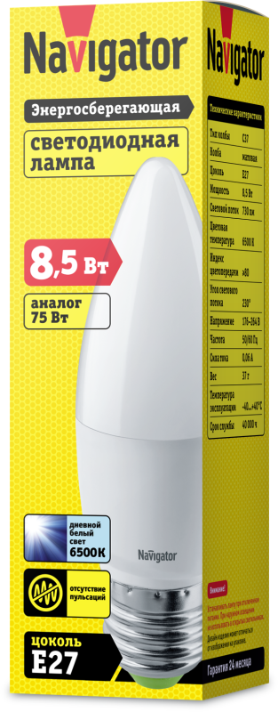 Лампа светодиодная 61 329 NLL-C37-8.5-230-6.5K-E27-FR 8.5Вт свеча матовая 6500К холод. бел. E27 730лм 176-264В Navigator 61329 NAVIGATOR