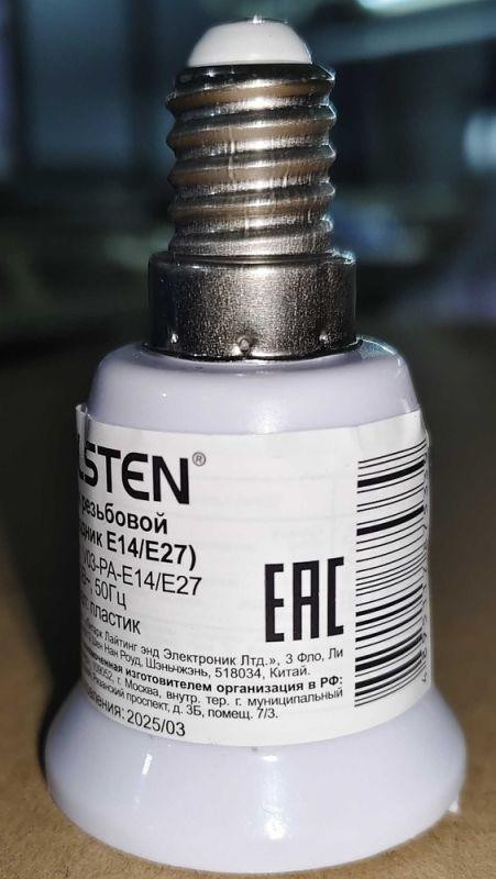 Переходник с цоколя V03-PА-E14 E27 E14 на E27 пласт. 220В 4А Volsten 12231