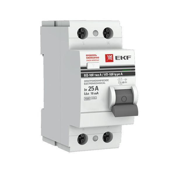 Выключатель дифференциального тока (УЗО) 2п 25А 10мА тип A ВД-100 (электромех.) PROxima EKF elcb-2-25-10-em-a-pro EKF