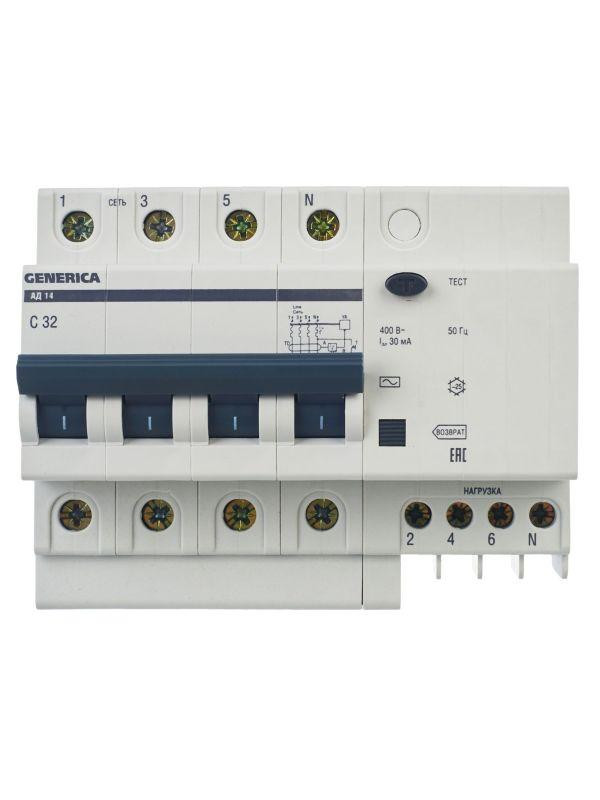 Выключатель автоматический дифференциального тока 4п 32А 30мА АД14 GENERICA MAD15-4-032-C-030