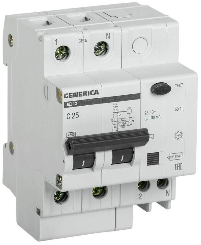 Выключатель автоматический дифференциального тока 2п 25А 100мА АД12 GENERICA MAD15-2-025-C-100