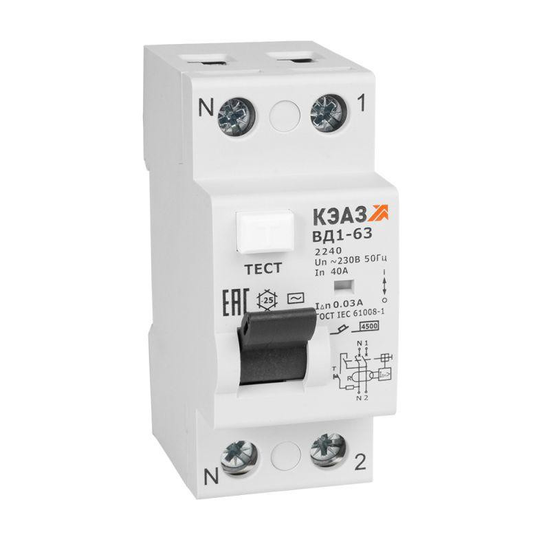 Выключатель дифференциального тока (УЗО) 2п 40А 30мА тип AC ВД1-63 2240 УХЛ4 КЭАЗ 221905 КЭАЗ