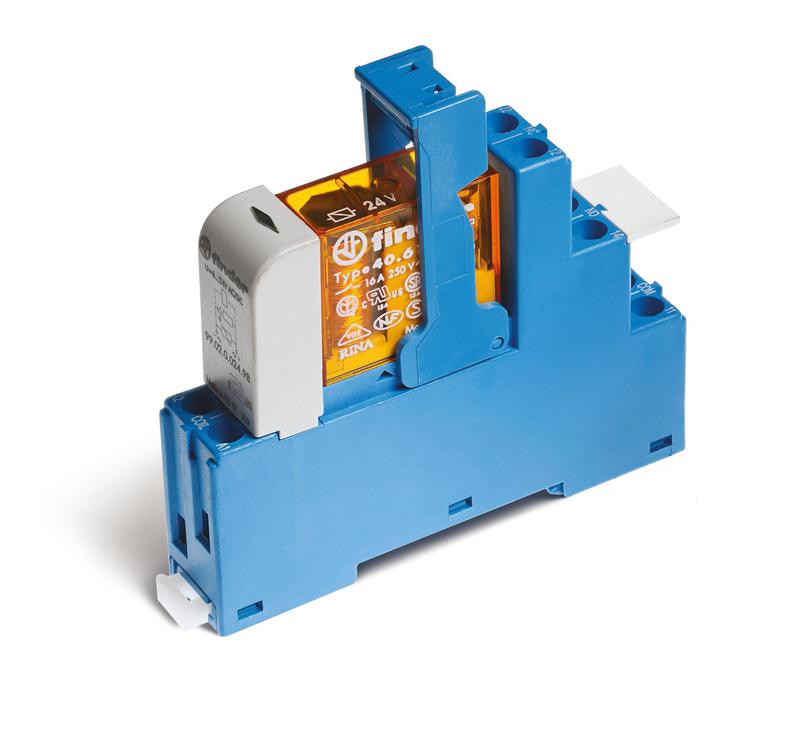 Модуль интерфейсный (сборка 40.61.7.024.0000 + 99.02.9.024.99 + 95.05SPA) электромеханич. реле 1CO 16А AgCdO 24В DC (чувствит.) IP20 винт. клеммы пластик. клипса LED + диод FINDER 486170240050SPA FINDER