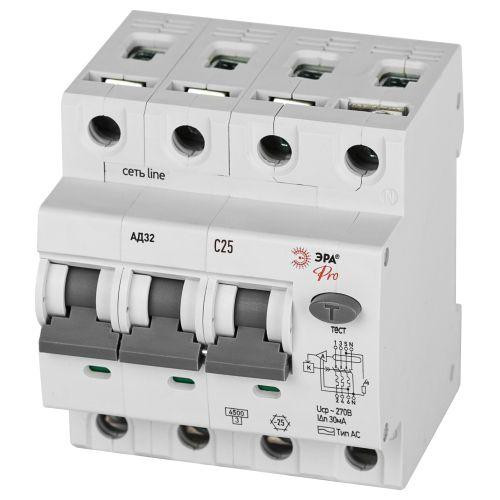 Выключатель автоматический дифференциального тока 3P+N C 25А 30мА тип AC защита 230В АВДТ 4.5кА PRO D32E4C25AC30P АД32 электронное Эра Б0057795 Эра