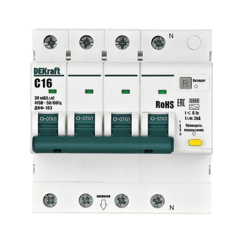 Выключатель автоматический дифференциального тока (АВДТ) 3P+N 16А 30мА AC х-ка C ДИФ-103 6кА DEKraft 16401DEK