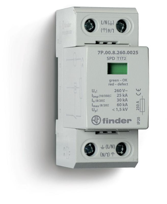 Устройство защиты от импульсных перенапряжений УЗИП тип 1+2 (1 варистор/искровый разрядник) модульный 36мм IP20 FINDER 7P0182601025 FINDER