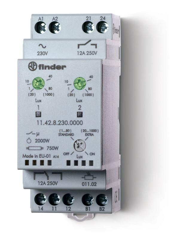 Фотореле модульное с фотоэлементом 011.02 монтаж на рейку 35мм 1CO + 1NO 12А (2 канала) 230В AC 1…80люкс 20…1000люкс 35мм фотореле IP20/фотоэлемент IP54 FINDER 114282300000 FINDER