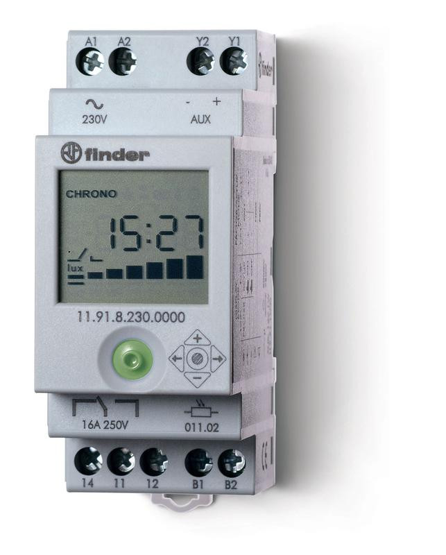 Фотореле модульное с фотоэлементом 011.02 цифровое реле времени монтаж на рейку 35мм 1CO 16А + 1доп.выход (для 19.91) 230В AC 1…150люкс 35мм фотореле IP20/фотоэлемент IP54 FINDER 119182300000 FINDER