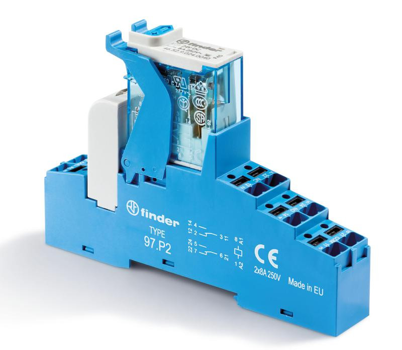 Модуль интерфейсный (сборка 46.52.9.125.0040 + 99.02.9.220.99 + 97.02SPA) электромеханич. реле 2CO 8А AgNi 125В DC IP20 винт. клеммы пластик. клипса LED + диод кнопка тест + мех. индикатор FINDER 4C0291250050SPA FINDER