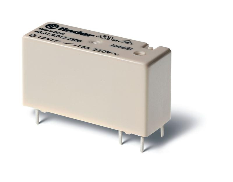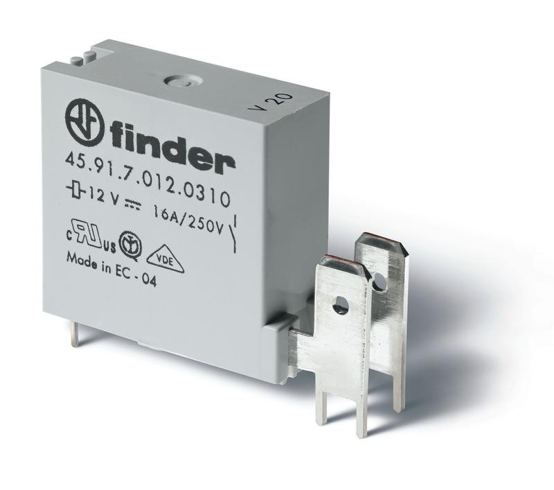 Реле низкопрофильное миниатюрное электромеханич. монтаж на печатную плату выводы с шагом 5мм + Faston 250(6.3х0.8мм) 1NO 16А AgNi (зазор >/=3мм) 12В DC (чувствит.) RTII FINDER 459170120310 FINDER