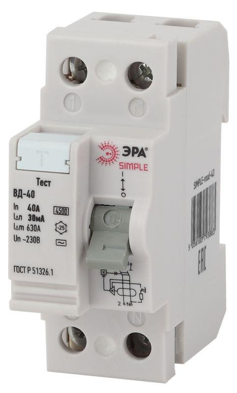 Выключатель дифференциального тока (УЗО) 2п 40А/100мА ВД-40 (электронное) SIMPLE-mod-47 ЭРА Б0039267 Эра
