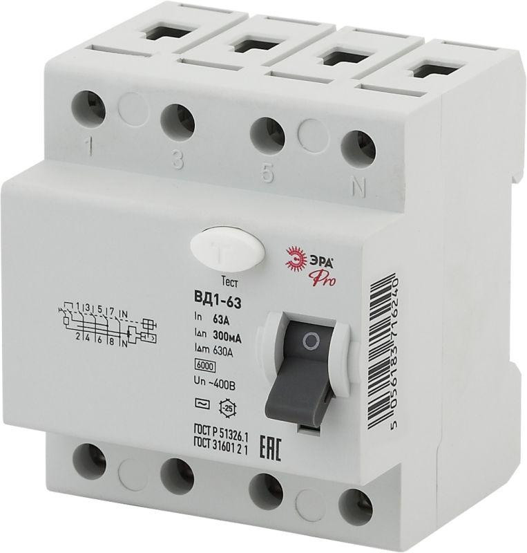 Выключатель дифференциального тока (УЗО) 3P+N 63А 300мА ВД1-63 Pro NO-902-46 ЭРА Б0031888 Эра