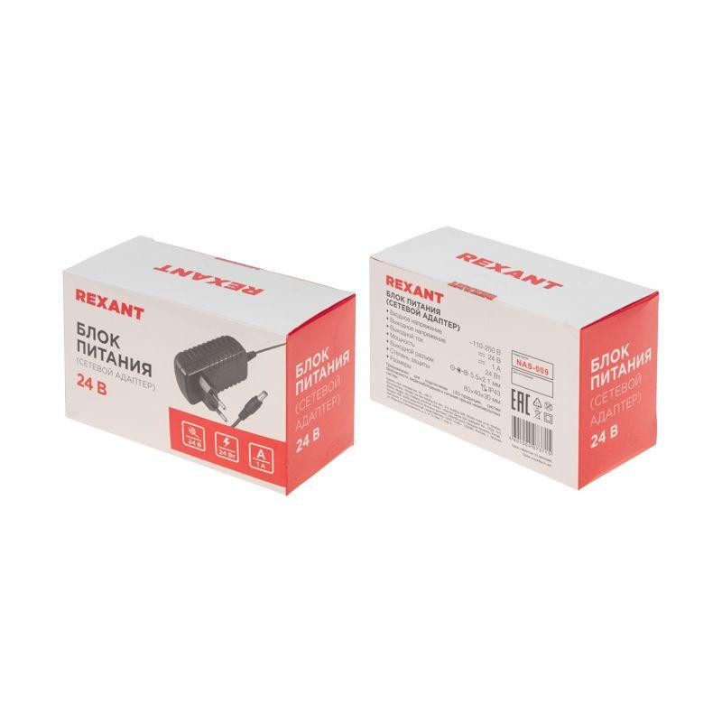 Источник питания 220В AC/24В DC 1А 24Вт с DC разъемом подключения 5.5х2.1 без влагозащ. IP23 Rexant 201-024-3 Rexant