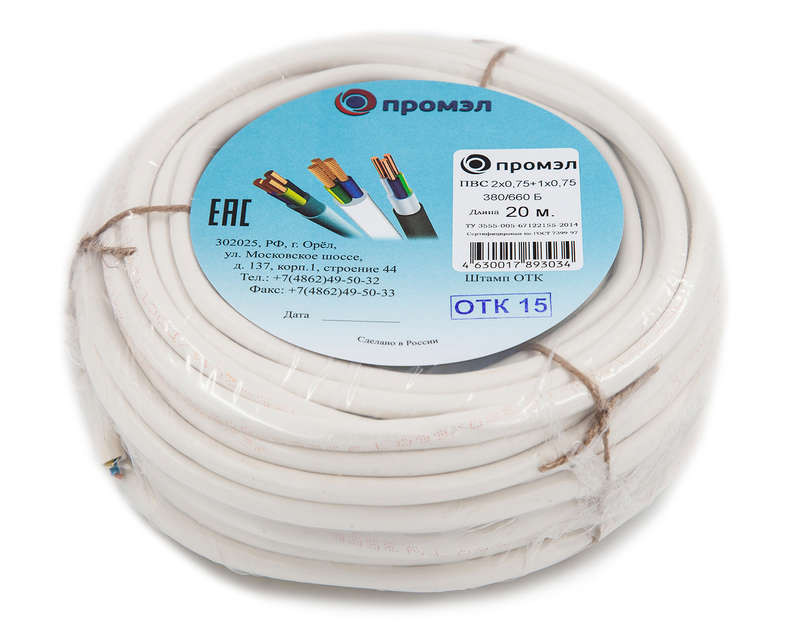 Провод ПВС 3х0.75 (2х0.75+1х0.75) 380В Б (бухта 20м) (шт) ПромЭл 13321580 ПромЭл