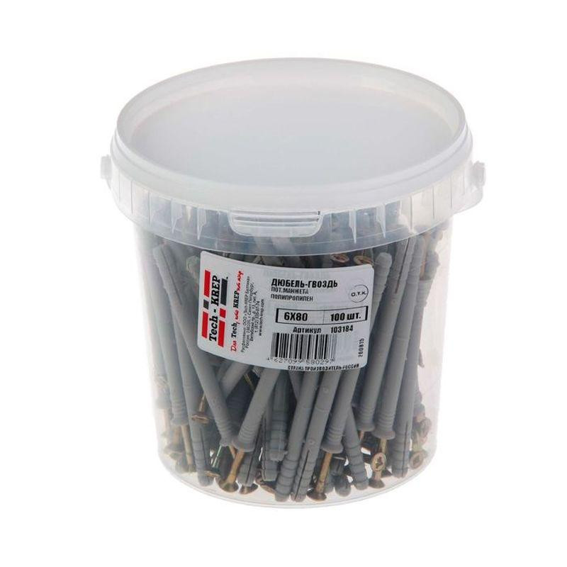 Дюбель-гвоздь 6х80 с потайной манжетой полипропилен (уп.100шт) ведро Tech-Krep 103184 Tech-KREP