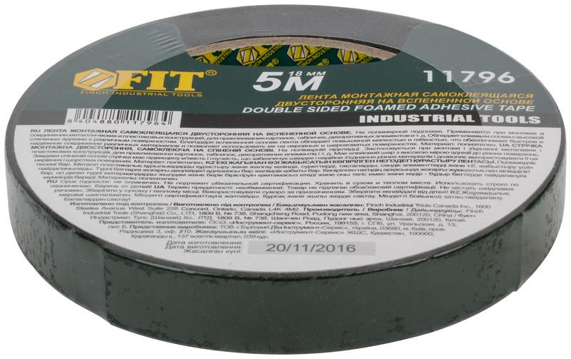 Лента клеящая 2-х сторонняя монтажная на вспененной основе с полимерной подложкой 18ммх5м FIT 11796