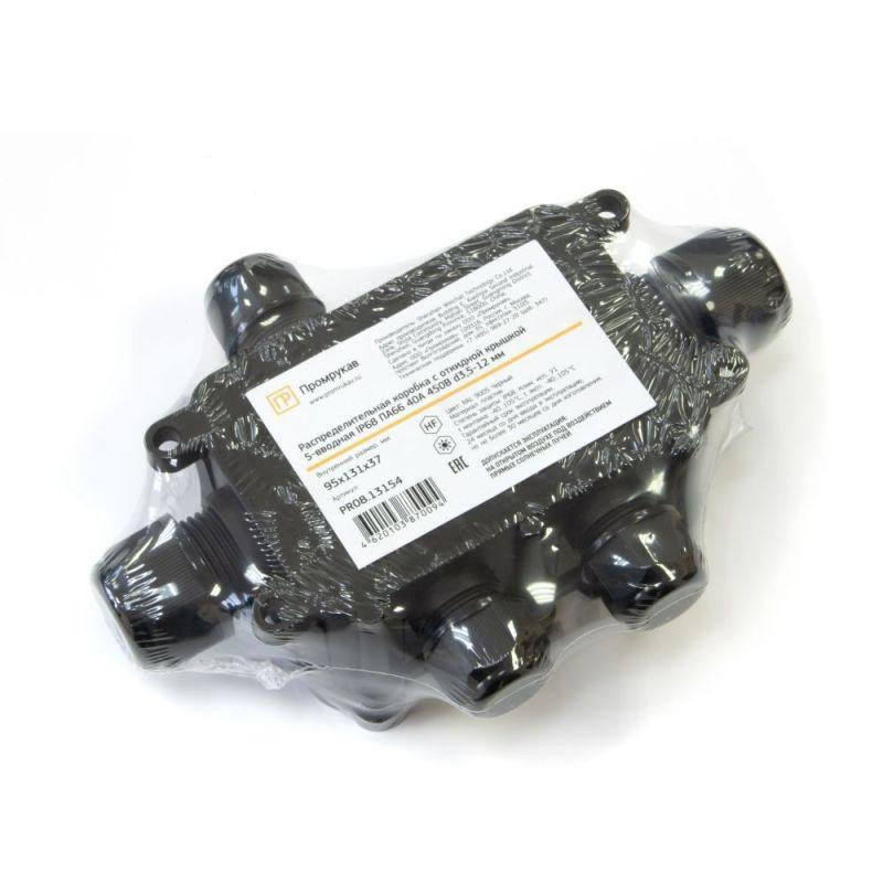 Коробка распределительная ОП 131х95х37 5-вводная IP68 ПА66 40А 450В d3.5-12мм с откидной крышкой черн. Промрукав PR08.13154