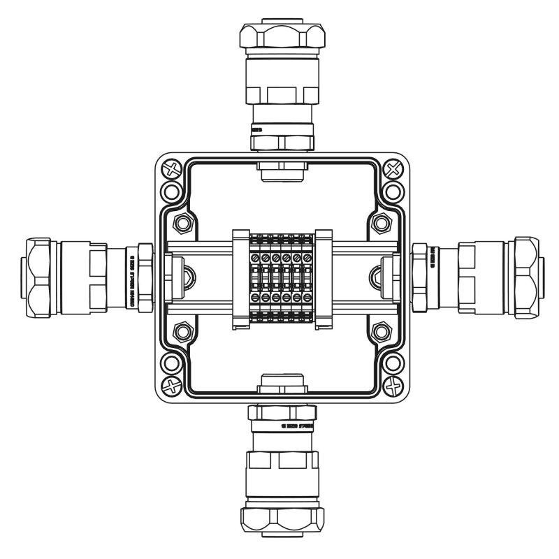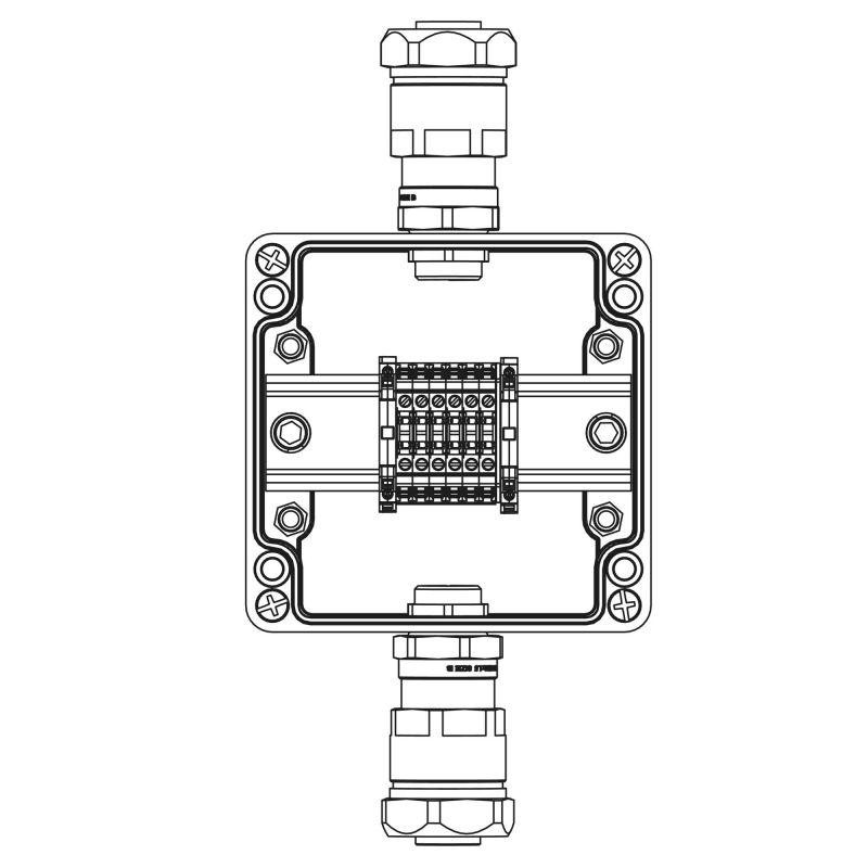 Корпус взрывозащищенный 120х120х90мм 1Exe IIC T5 Gb IP66Ex tb IIIB T95град.C Db Т5 40град.C кольца заземл. клеммы CBC.2-6шт ток А вводы сторона А: взрывозащ. кабельн. ввод ANP под небронир. кабель в металлорукаве M2 GRP DKC 1231.031.19.02G DKC