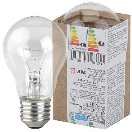 Лампа накаливания A50 60-230-Е27-CL 60Вт грушевидная Е27 230В ЭРА Б0039122 Эра