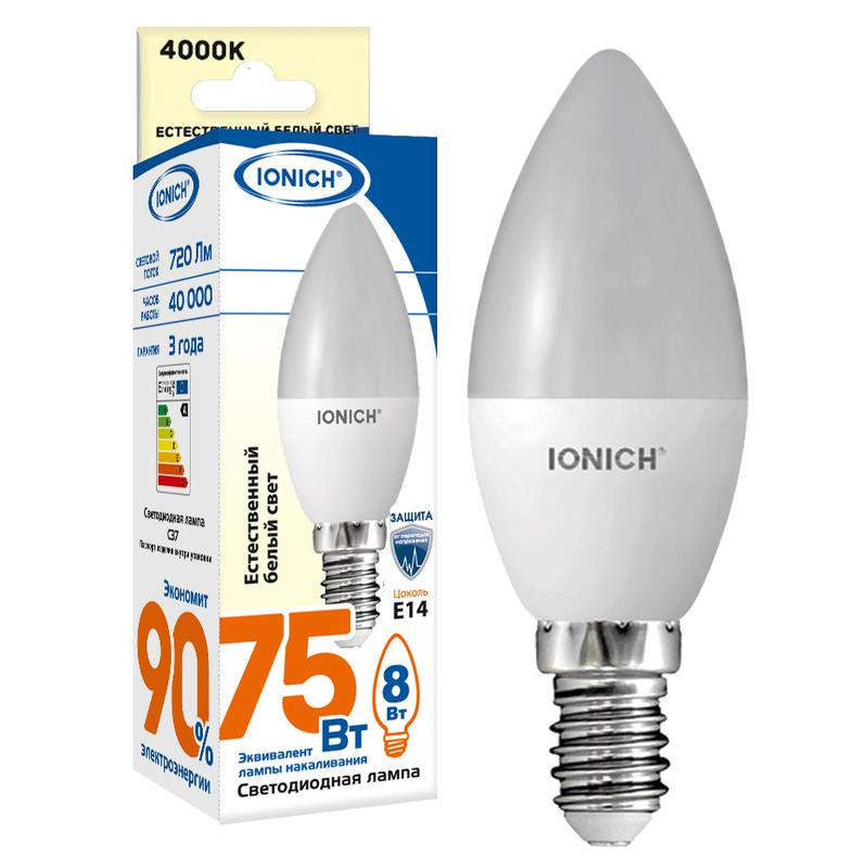 Лампа светодиодная ILED-SMD2835-C37-8-720-220-4-E14 (1300) IONICH 1535 IONICH