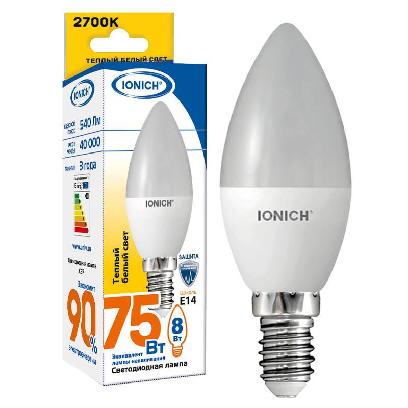 Лампа светодиодная ILED-SMD2835-C37-8-720-220-2.7-E27 (1304) IONICH 1537 IONICH