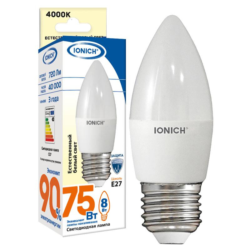 Лампа светодиодная ILED-SMD2835-C37-8-720-220-4-E27 (1306) IONICH 1538 IONICH