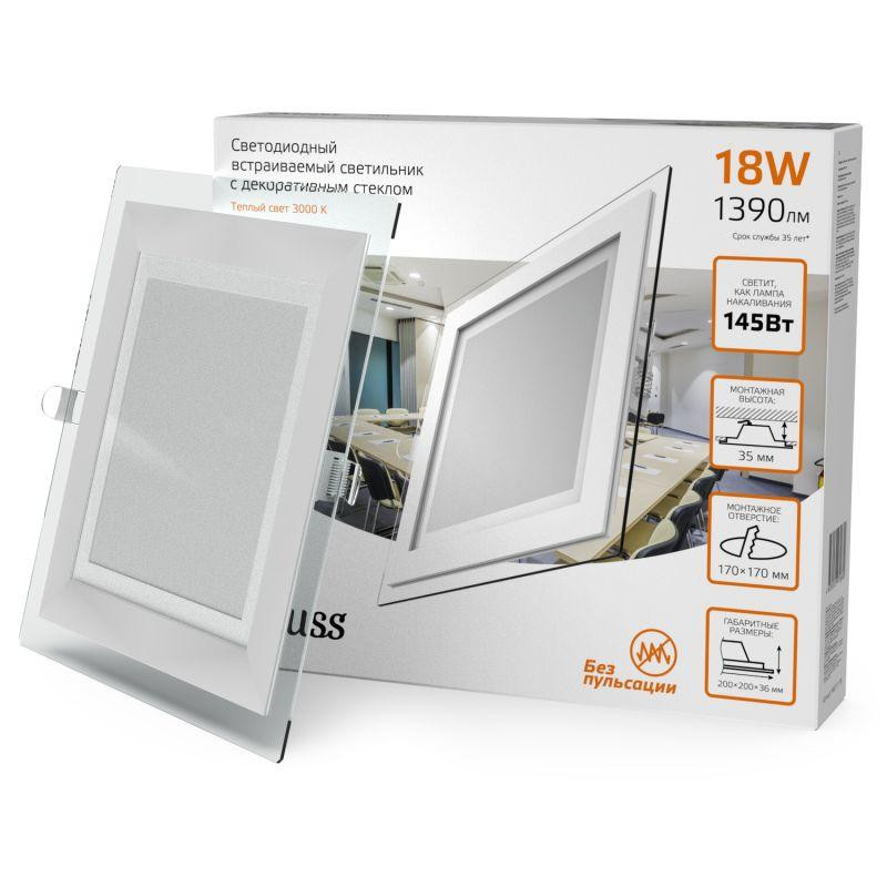 Светильник светодиодный Glass 18Вт 3000К IP20 1390лм 220-240В ДВО квадрат с декоративн. стеклом бел. GAUSS 948111118