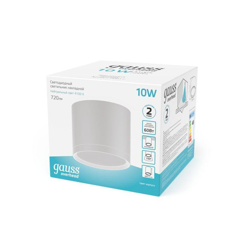 Светильник светодиодный Overhead 10Вт 4100К IP20 720лм 170-240В ДПО цилиндр накладной с рассеив. бел. GAUSS HD024