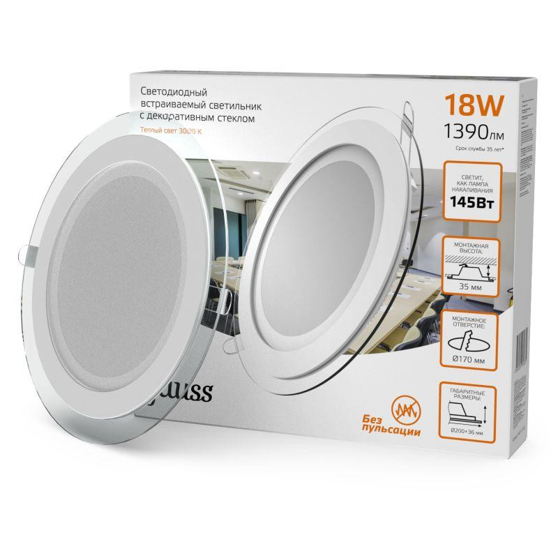 Светильник светодиодный Glass 18Вт 3000К IP20 1390лм 220-240В ДВО круг с декоративн. стеклом бел. GAUSS 947111118