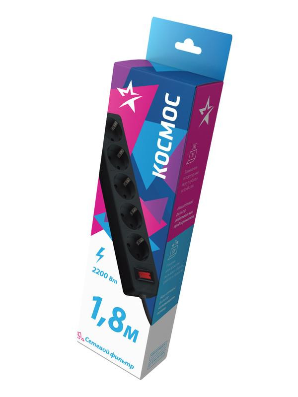 Удлинитель с сетевым фильтром 5х1.8м с заземл. 10А IP20 2.2кВт ПВС 3х0.75 с выкл. с индикатором сети черн. КОСМОС FKsm1.8m-5g(B) КОСМОС