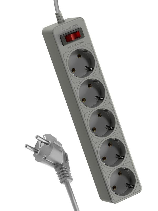 Удлинитель с сетевым фильтром 5х3м с заземл. 10А IP20 2.2кВт ПВС 3х0.75 с выкл. с индикатором сети сер. КОСМОС FKsm3m-5g(G) КОСМОС