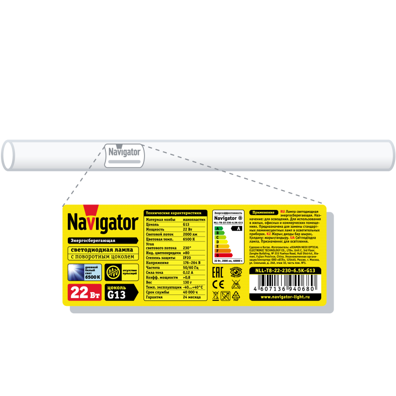 Лампа светодиодная 94 068 NLL-T8-22-230-6.5K-G13 22Вт линейная 6500К холод. бел. G13 2000лм 176-264В поворотный цоколь Navigator 94068 NAVIGATOR