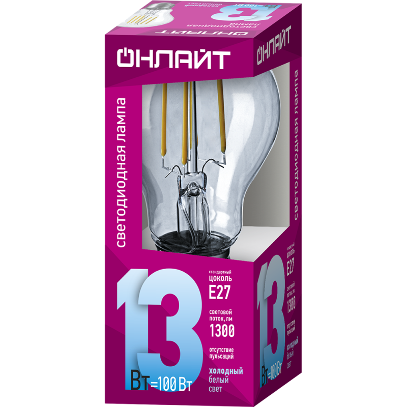 Лампа светодиодная филаментная 80 877 OLL-F-A60-13-230-4K-E27 13Вт грушевидная прозрачная 4000К нейтр. бел. E27 1300лм 220-240В ОНЛАЙТ 80877 ОНЛАЙТ