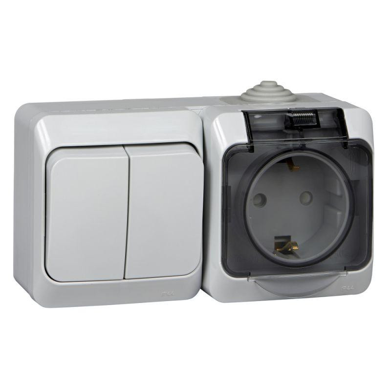 Блок ОП Этюд (1-м розетка 16А 250В евростандарт с заземл. защ. шторки + 2-кл. выкл.) IP44 сер. SE BPA16-242C