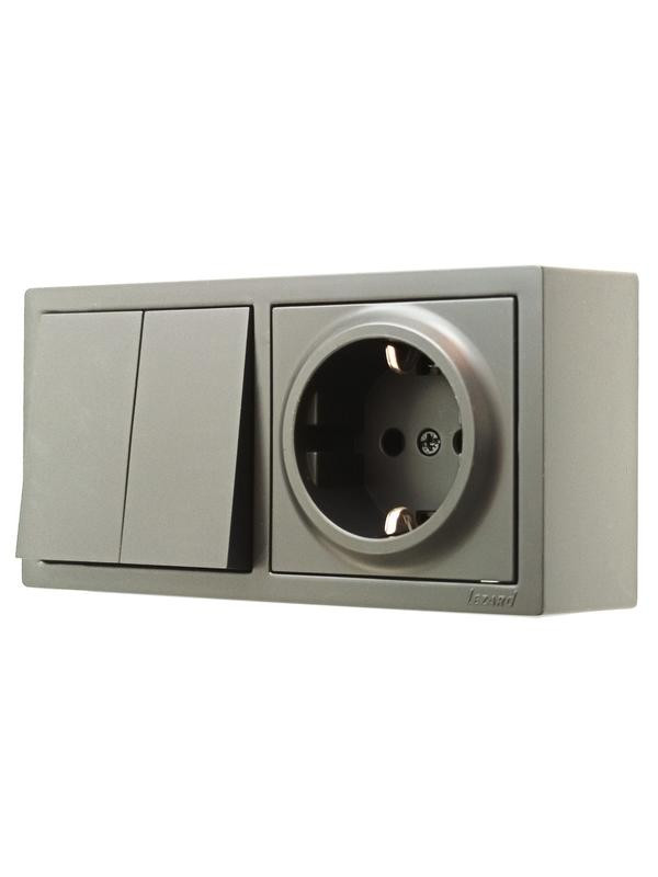 Блок Выключатель 2-клав. и розетка 1-местн с заземл. LETO платина горизонталь LEZARD 752-3500-170BKP LEZARD