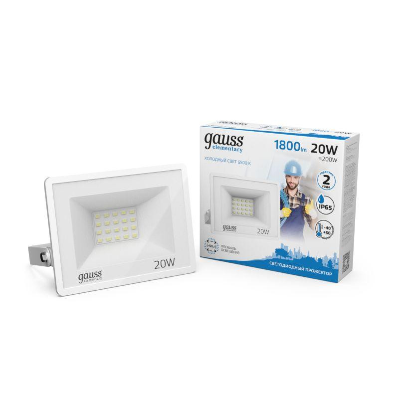Прожектор светодиодный Elementary 20Вт 6500К IP65 1800лм 200-240В ДО бел. GAUSS 613120320