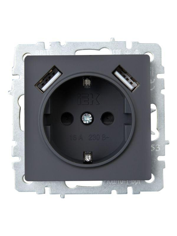 Розетка BRITE РЮш10-1-БрГ 16А с USB A+A 2.1А с заземл. защ. шторки механизм графит IEK BR-R14-16-U21-D21-K53 IEK