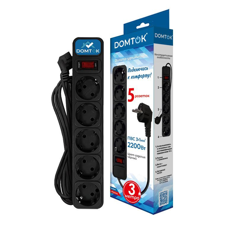 Удлинитель с сетевым фильтром 5х3м с заземл 10А IP20 2.2кВт ПВС 3х1 с выкл. черн. DOMTOK 2538