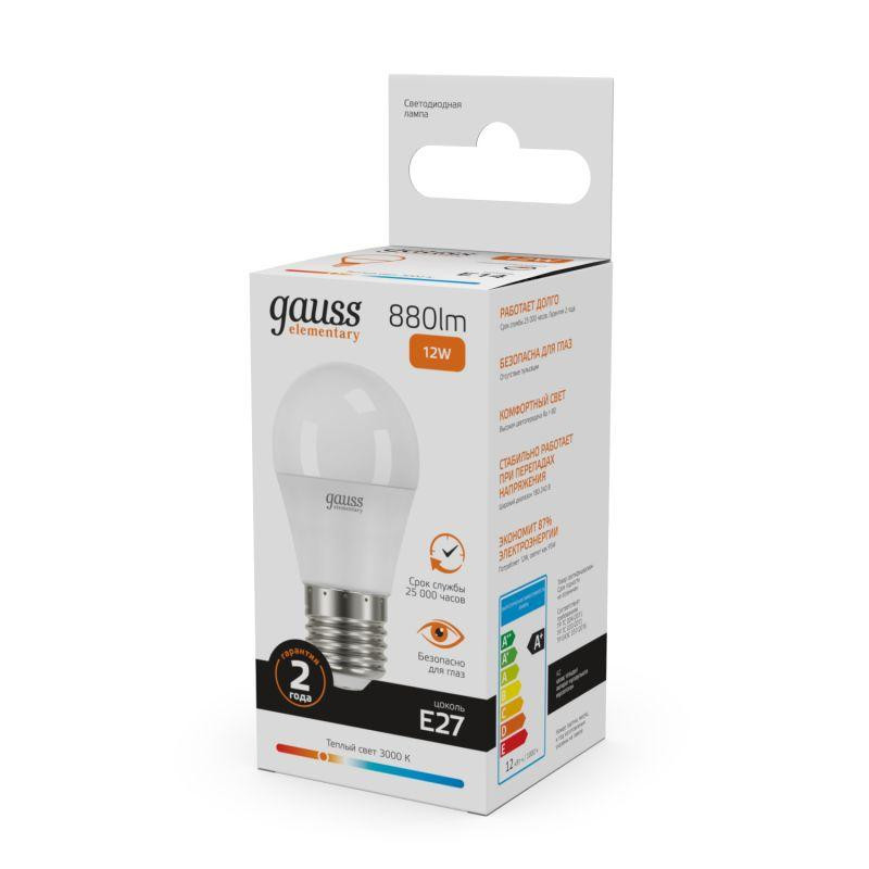 Лампа светодиодная Elementary 12Вт P45 шар 3000К тепл. бел. E27 880лм GAUSS 53212