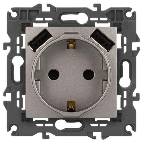 Розетка Elegance 14-4109-16 16A 250В 2P+E защ. штор. с 2xUSB 3А 5В титан Эра Б0065775 Эра