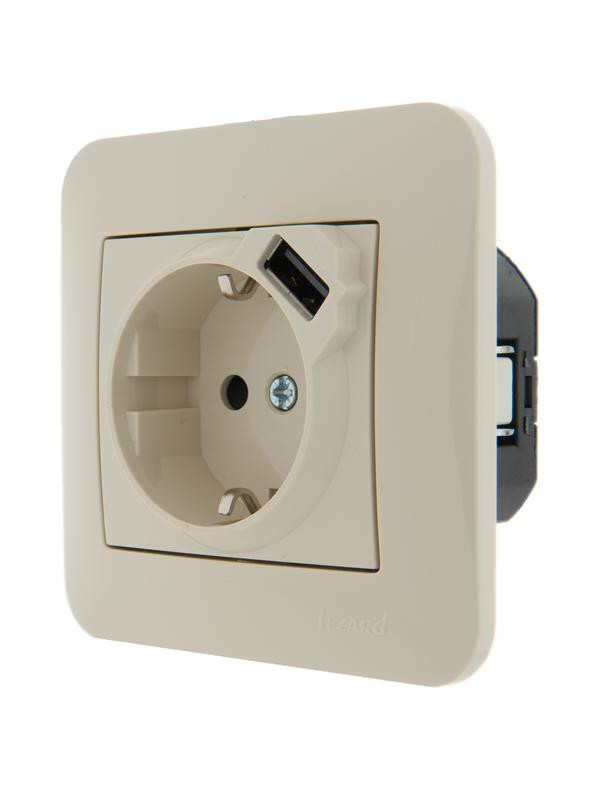 Розетка 1-м СП Karina 16А с заземл. с заряд. устройством USB механизм крем. LEZARD 707-0388-181 LEZARD