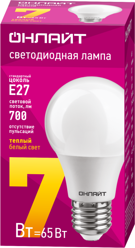 Лампа светодиодная 71 647 OLL-A60-7-230-2.7K-E27 7Вт грушевидная 2700К тепл. бел. E27 525лм 220-240В ОНЛАЙТ 71647 ОНЛАЙТ