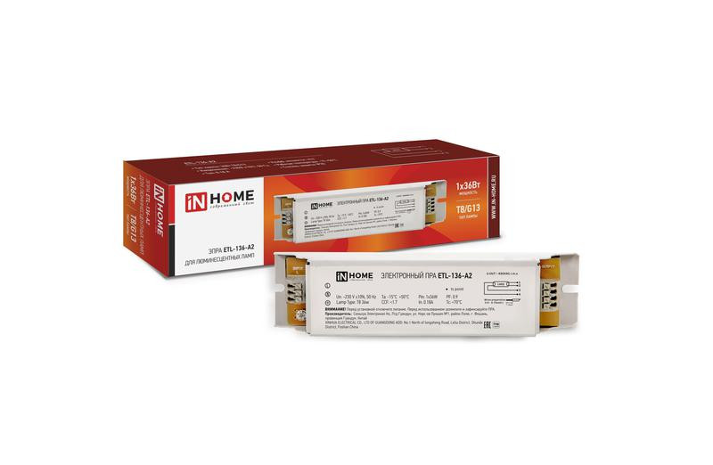 Аппарат пускорегулирующий электронный (ЭПРА) для люминесцентных ламп ETL-136-А2 1х36Вт Т8/G13 IN HOME 4690612034607 IN HOME