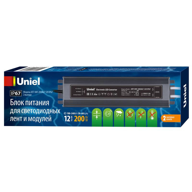 Блок питания UET-VAF-200A67 12В IP67 2 выхода ультратонкий 200Вт метал. корпус Uniel UL-00007579 Uniel