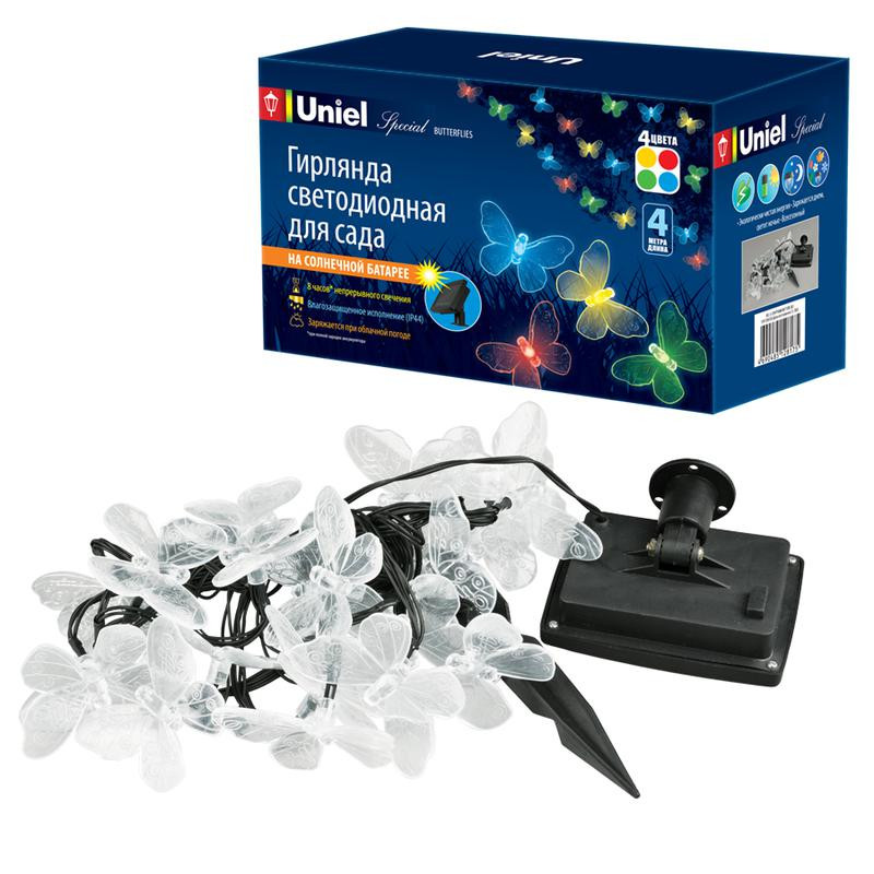 Гирлянда садовая USL-S-129/PT4000 BUTTERFLIES солнечная батарея "Бабочки" 20 светодиодов разноцветный свет IP44 Uniel UL-00006557 Uniel