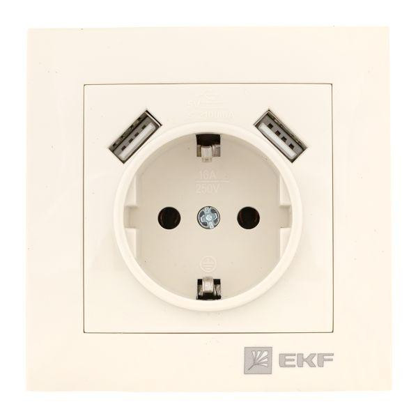 Розетка 1-м СП Валенсия 16А IP20 с заземл. защ. шторки с 2-мя заряд. устройствами USB 2.1А крем. PROxima EKF EWR16-028-20-2USB EKF