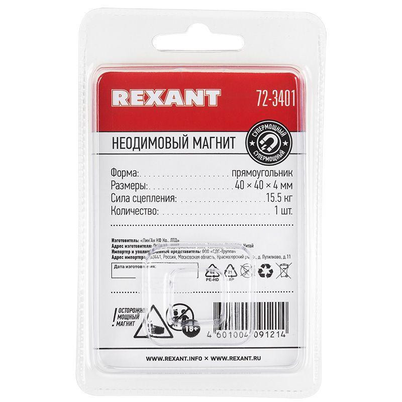 Магнит неодимовый прямоугольник 40х40х4мм сцепление 15.5кг (блист.) Rexant 72-3401 Rexant