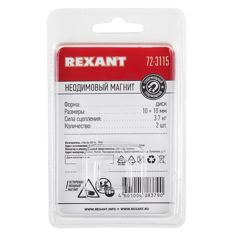Магнит неодимовый диск 10х10мм сцепление 3.7 кг (блист.2шт) Rexant 72-3115 Rexant